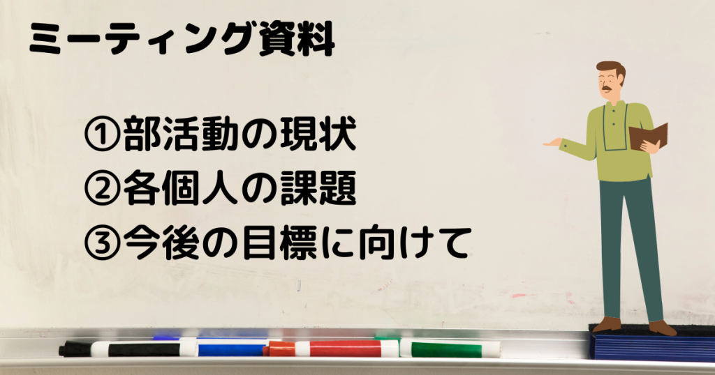 部活動として、競技を頑張って練習するのも大事ですが、週に1回はミーティングを開いて目標のすり合わせを行うことも必要です。